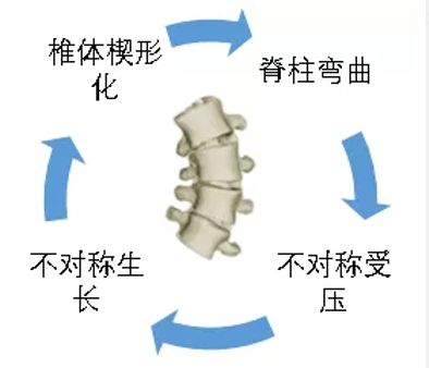 研究表明,椎體的楔形化是脊柱側(cè)彎的開始。起初,楔形化不明顯,但在不平衡的力學(xué)作用下,椎體兩側(cè)的生長不再一致,脊柱凹側(cè)由于受壓較大,生長變慢,而凸側(cè)受壓小,生長快,導(dǎo)致椎體楔形越來越嚴(yán)重,形成惡性循環(huán)。正是因為側(cè)彎這種發(fā)展機(jī)制,我們建議要早發(fā)現(xiàn)早干預(yù),阻斷惡性循環(huán)鏈條。