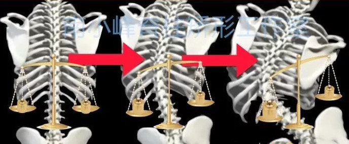 如下圖。當脊柱是直的時,天平的兩邊重量分配一樣。隨著側彎和偏移發(fā)生,天平左邊重量大,右邊小。會把脊柱不斷的拉向壞的方向。