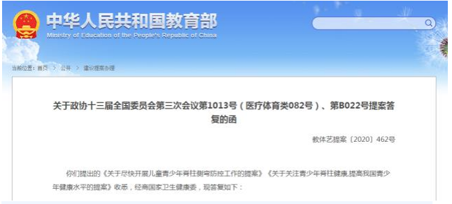 近日,教育部網(wǎng)站發(fā)布對(duì)《關(guān)于盡快開展兒童青少年脊柱側(cè)彎防控工作的提案》和《關(guān)于 關(guān)注青少年脊柱健康,提高我國青少年健康水平的提案》的答復(fù).