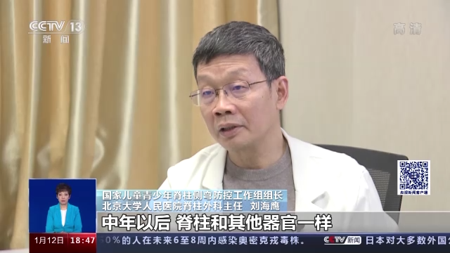 國家兒童青少年脊柱側(cè)彎防控工作組組長、北京大學(xué)人民醫(yī)院脊柱外科主任 劉海鷹:中年以后的話,脊柱和其他器官也一樣,都在發(fā)生老化,有的就是產(chǎn)生的一種成人性的退變性的脊柱側(cè)彎,脊柱的變形、增生,會(huì)造成椎管的狹窄,進(jìn)而產(chǎn)生腰疼和下肢的這些癥狀。