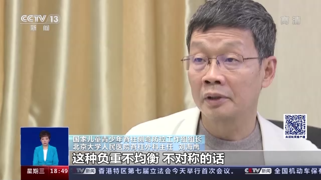 國家兒童青少年脊柱側(cè)彎防控工作組組長、北京大學(xué)人民醫(yī)院脊柱外科主任 劉海鷹:像躺著的情況下的話,脊柱之間、椎體與椎體之間,它的壓力如果是1的話,你站起來的話中間壓力是2,然后的話你坐著的情況下就是4倍的壓力,坐姿不好的話,屁股撅著,往前哈著腰的情況下,腰骶部這種負(fù)荷量能達(dá)到8倍。彎腰的情況下,拎重東西,這種負(fù)荷更大,甚至達(dá)到10倍以上。一次沒問題,但是的話久而久之,椎間盤就會(huì)過早老化、退變、增生,進(jìn)而產(chǎn)生退變側(cè)彎也好,有的滑脫也好,有的狹窄也好,這樣或者那樣的問題都會(huì)出現(xiàn)。